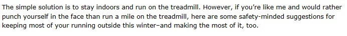 For the record, I am not a big fan of treadmills. But if I had access to one and it meant I could still get my run in as planned, I would deal with it. In the meantime, I will try to utilize some of these eight winter running tips. Today I am following tip #6: