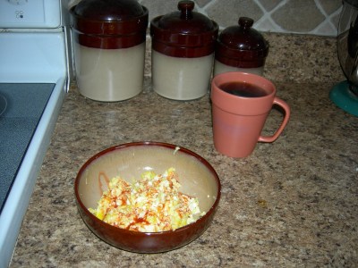 Today the trail was in a little better condition, but it was still covered in snow and ice in a lot of spots. We did 3 miles on the trail and then finished up the last 2 around town. The temperature wasn’t too bad either. It was around 20 degrees when we started out, which really wasn’t bad since it wasn’t windy at all. But once we finished our run and stood around talking for awhile, it felt cold. Now I’m warming up with some scrambled eggs with hot sauce and a steaming mug of coffee 🙂