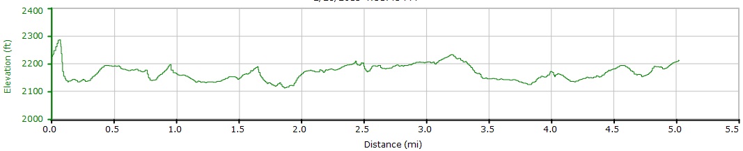 What’s strange is we live closer to 2300 feet, so I’m not sure what was going on with my Garmin today, as it seems to think I started at 2700 feet. Here is the elevation profile from when I ran the same route last week, except I turned around a half mile sooner since it was 5 miles instead of 6. I don’t have a clue why they look so different, but I promise today was a hilly run, no matter what the elevation shows. 🙂