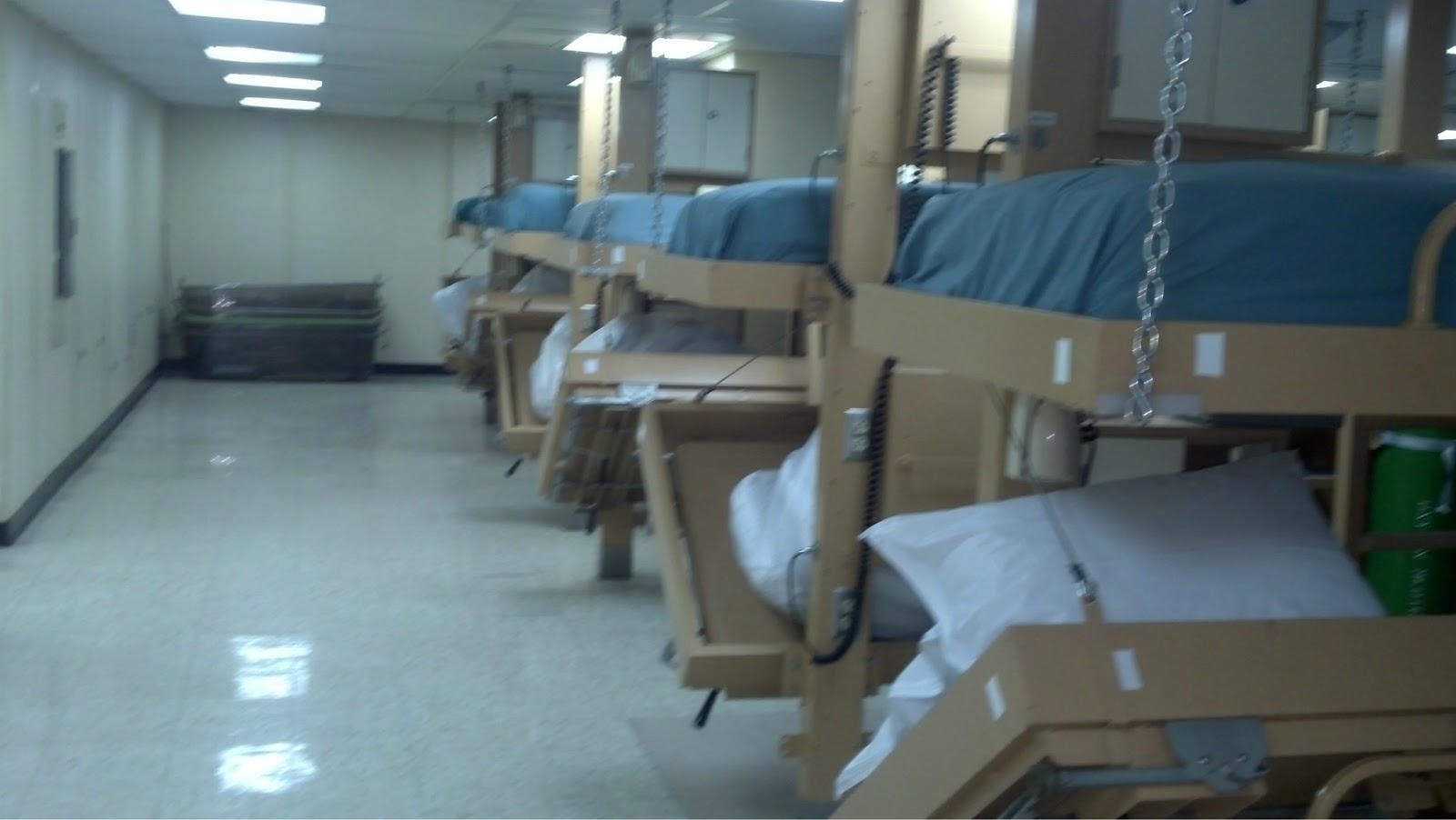 They’re set up like bunk beds, and there were over 300 beds in this ward. Less critical patients use a ladder to get to the top bunks. There were spots for IV bags to be hung and nurse call buttons. The ship also included a very large ICU, complete with beds equipped with air mattresses to help prevent bed sores (when the skin breaks down from patients laying in one spot with pressure on a particular area). The beds also alarmed if the patient tried to get out of bed. When the ship responded to the disaster in Haiti, they had a special “quiet” section of the ICU sectioned off where patients who had lost limbs woke up from surgery.