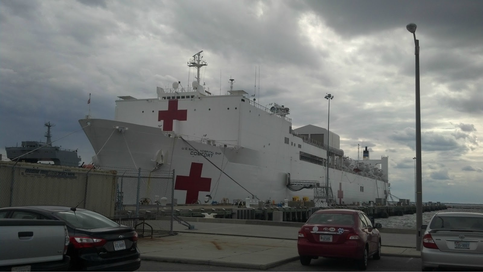 On Wednesday I had a meeting for work on the Naval Base in Norfolk, VA. At the end of our meeting we had the opportunity to tour the USNS Comfort, one of the U.S. Navy’s hospital ships. It has been used to provide relief after disasters such as Haiti, and also provides on-site emergency care for U.S. combatants in a time of war. It has been deployed during Operation Desert Storm, as well as to New York during the terrorist attacks in 2001. It has also served as an afloat trauma center in the Persian Gulf during Operation Iraqi Freedom.