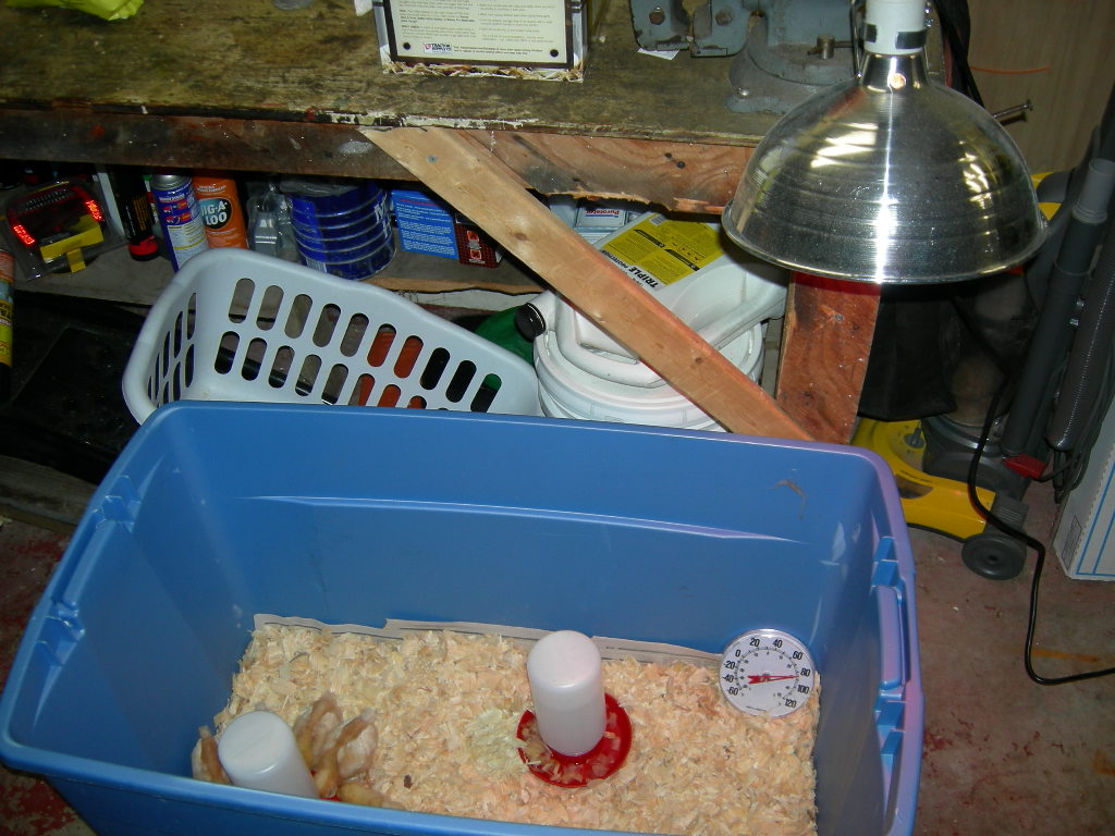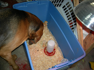 There was one incident this week, aside from the chick pasting up. I was out in the garage with the chicks, and someone opened the door to the basement and Hank ran in. We have let him in the garage a few times to see them (and see what the “peeping” noise was) and he mostly just sniffed them like crazy and stared at them. Well apparently we’re past that point, because he ran right in, stuck his head down in the brooder and tried to snatch one up. Luckily I grabbed him in time, and no one was hurt! This is a reenactment, with Barry standing by to hang on to Hank.