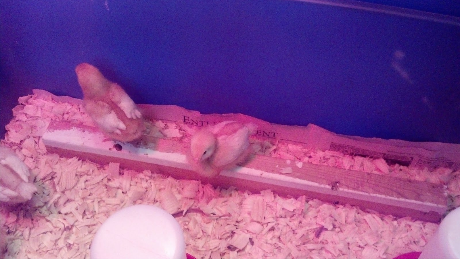 We made a few changes in the brooder this week. First of all we had to add chicken wire to the top of it. We came downstairs one morning to find one of the chicks “roosting” (where they sit on a branch or ledge) on the lip of the Rubbermaid tub!