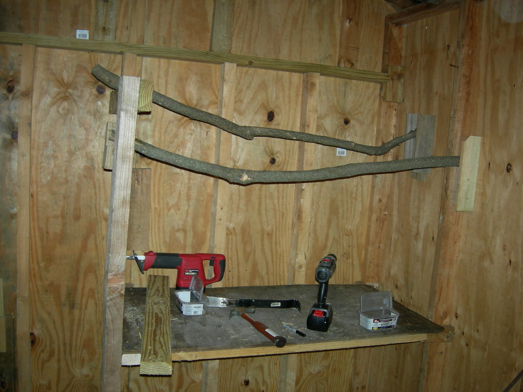 We also installed our roosting poles in the coop. They are about 4 1/2 and 5 feet off of the ground. We built the table/shelf area under it to keep a tray on. Chickens tend to make the most droppings in their roosting area, so we will keep the tray on the tabletop under the poles so that this area can be cleaned more frequently than the coop itself. It also gives us an area underneath to keep plastic tubs with their bags of feed.