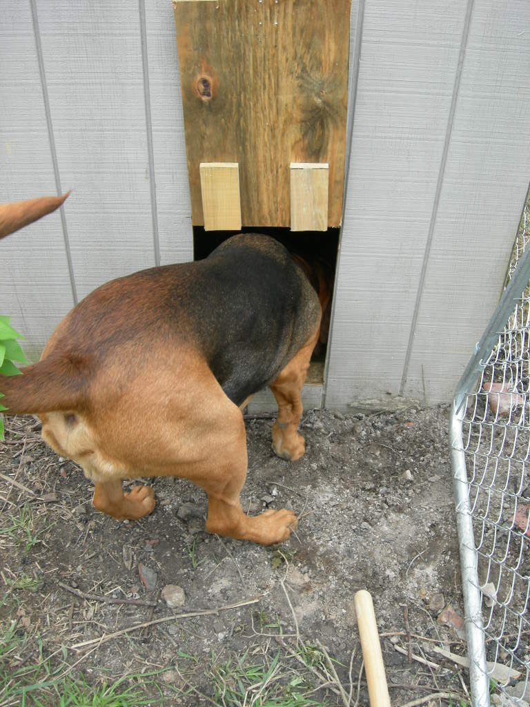 Hank thinks he can fit inside the chicken coop through the hatch door, but I don’t think that he does….