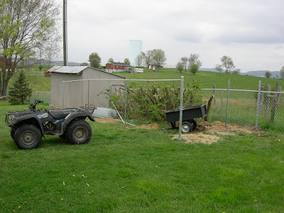 So far Barry has cut the large bushes with a chainsaw, so that they will fit under the overhead covering we will put on to protect the chickens from hawks. He has also gotten all of the posts in for the run area.