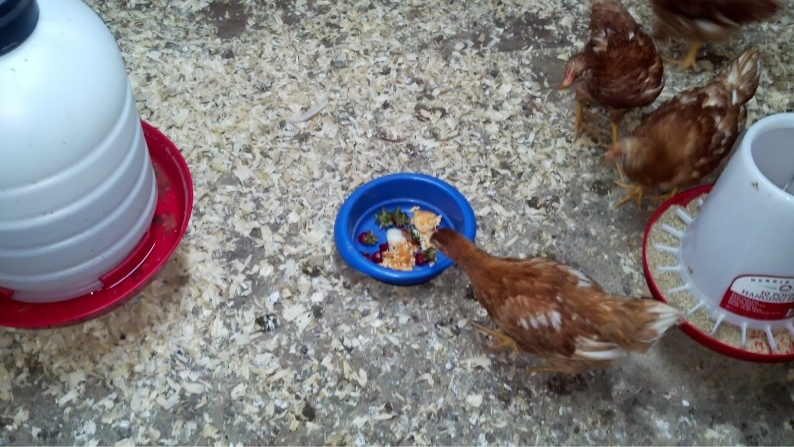 On Friday we tried something new with the chickens. I read that that they really like table scraps and that most foods are safe for them. There are some big no no’s like avocados and uncooked beans. I found a good article HERE about what is okay and what is not okay to feed them. You shouldn’t feed them certain foods because it will cause an off flavor in the eggs, but other foods are actually toxic. That being said, I had a bunch of scraps from cutting up fruit that we decided to give them.