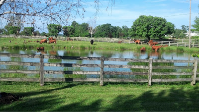 Today I’m feeling a bit better, so I went back to being a productive member of society (and by that I mean I went to work). After work I headed out for an easy 3 mile run. I actually debated whether or not to hit the track, since I hadn’t run since Saturday’s race (oh my gosh!). But a mile into my run I knew I had made the right decision. My legs felt fine, but my body was already out of energy. Not to mention I was not enjoying the pounding headache / 85 degree heat combination. It was hot enough that the cows, who happen to live across the road from the fainting goats, decided to hang with the ducks in the pond today.