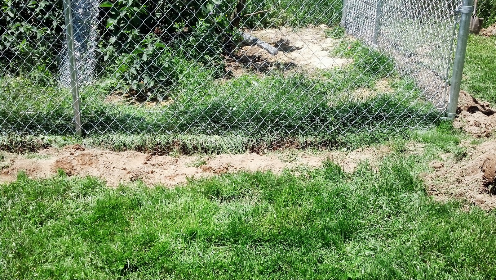 Last Sunday Barry and I spent the majority of the day digging a trench around the two sides of the chicken run that separate it from the rest of the yard. Then we attached chicken wire to the inside of the chicken run, pulled it under the fence, and buried it in the trench. The chicken wire is buried between 8-10 inches in the ground.
