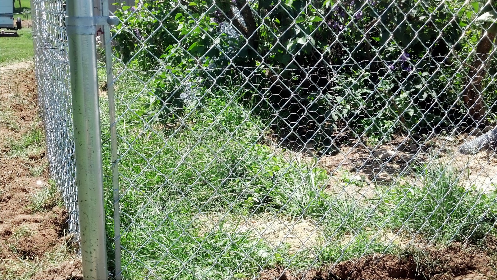This will keep the dogs and other predators from being able to easily dig under the chain link fence to get after the chickens. Here is a closer picture of it, since the chicken wire is difficult to see.