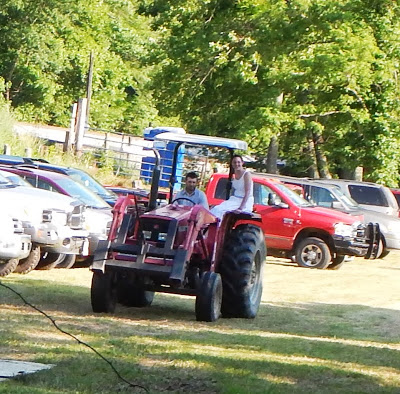 This evening Barry and I attended a friend’s wedding reception. They had their wedding last weekend down in South Carolina, but held a second reception today since they also have a lot of friends and family in this area. The bride and groom arrived in style on one of the groom’s tractors.