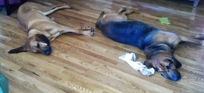 There is actually a funny (to me) story behind this picture. Hank (the black and tan) was laying on the floor asleep in the above position. Scout was over in the corner chewing on a toy. All of a sudden she got up, walked over to Hank, walked a circle around him while looking down at him, and then laid down behind him in the same position and went to sleep. Monkey see, monkey do.