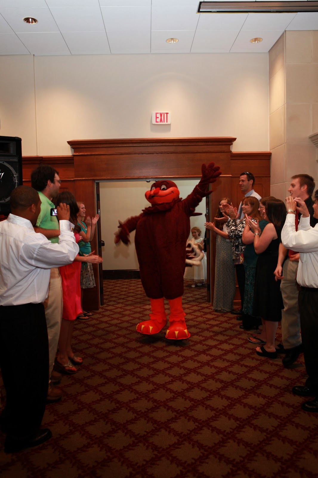 We held our reception across the street in Owen’s Banquet Hall. We invited the Hokie Bird (VT’s mascot), and he was kind enough to attend. We did a special entrance to ‘Enter, Sandman’, which is the song the football team runs onto the field to. Friends and family lined up on either side of the doors and jumped up and down, and the Hokie Bird led the way.
