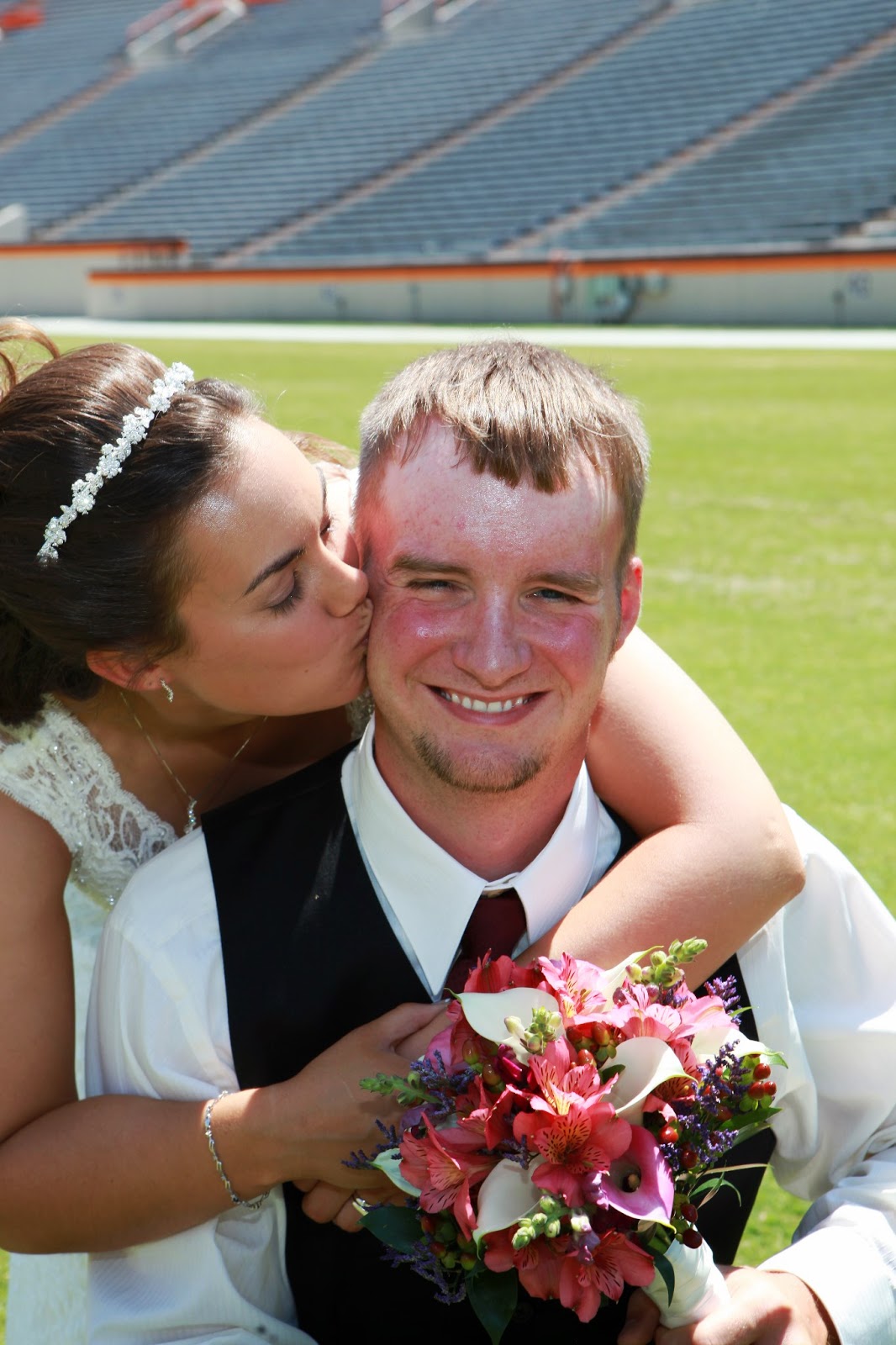 I got goose bumps reading this!!! I think Bill and I should renew our vows on campus on August 1! 🙂 Here are my thoughts:1. I absolutely love the picture that was taken in the chapel! 2. I wanted to start jumpin’ as soon as you mentioned Enter Sandman!3. I am so jealous that Hokie Bird attended your wedding!4. I love that Carol Lees made your wedding cake!5. I love Barry’s Holstein cow grooms cake!6. I didn’t know that Owens has such a nice banquet hall.7. I love the picture of you and Barry on Warsham Field in Lane Stadium!8. I want to get in my car and drive to Blacksburg right now!9. Happy, happy, happy anniversary!!!