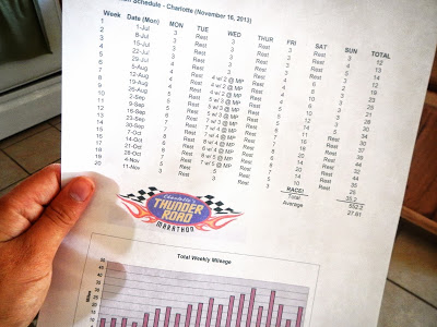 Today is an exciting day because it is day one of my 20 week marathon training plan, with all roads leading to the Charlotte Thunder Road Marathon . I know what you’re thinking… calm down, it’s day 1 and you have a long ways to go. And I know I do. However, I cannot help but smile when I think about the path I’m starting down. There will be good days, great days, and terrible ones, but in the end I expect to be toeing the line (figuratively… we all know I’m not starting at the front of any race) on Saturday, November 16 ready and raring to go.