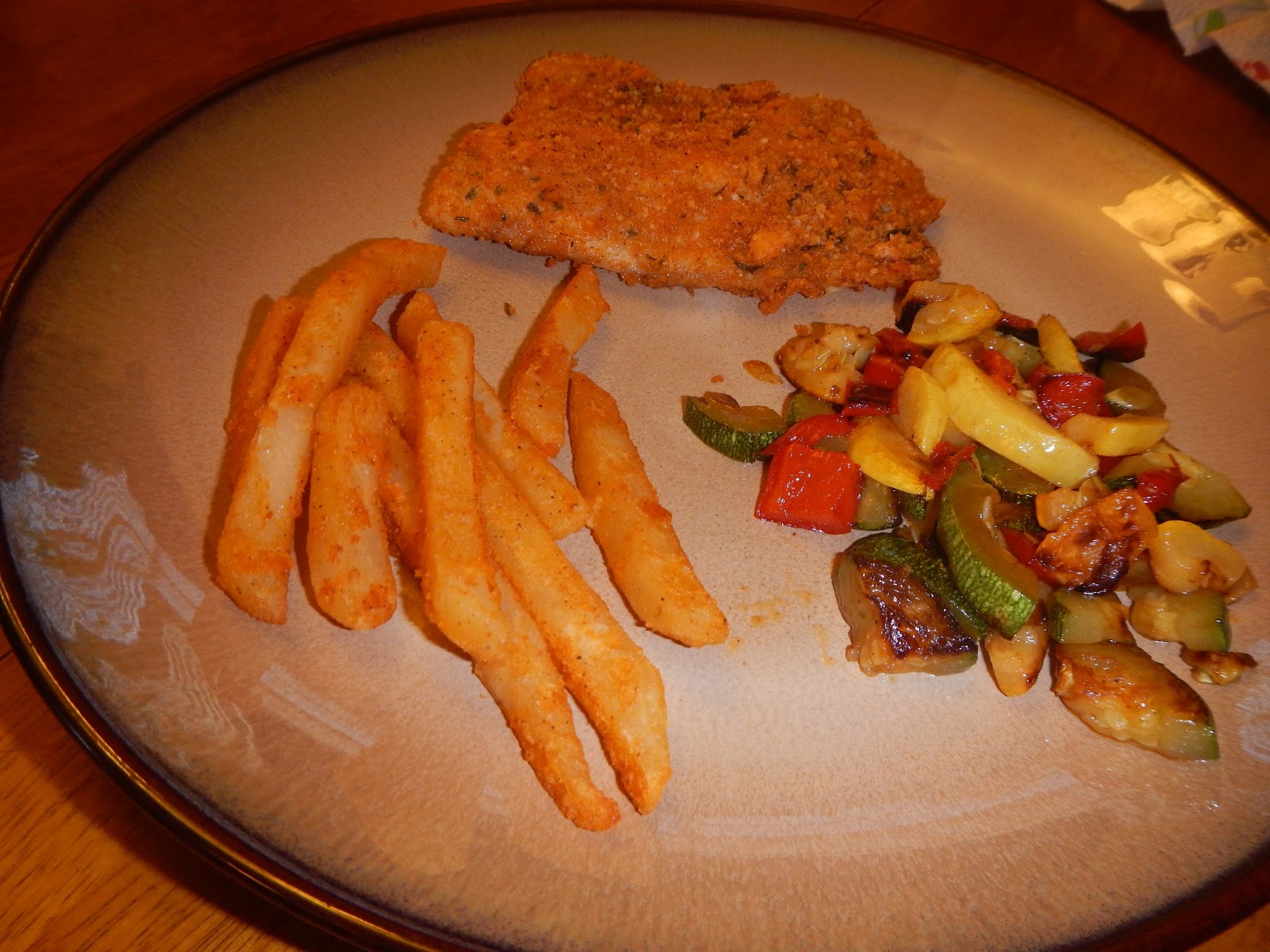 This evening I made Parmesan-crusted Tilapia, pan-seared veggies, and French fries for dinner. This is the same dinner I fixed on Friday night when we were camping, except tortellini instead of fries. I liked it so much that I decided to fix it again tonight, since we had leftover squash and peppers. My dad is probably wondering who I am right now, since traditionally I don’t eat fish…. Or squash…. Or peppers. But I really like this dinner, especially for summer time.