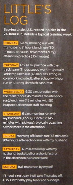 The August 2013 issue of Running Times has a feature article on Sabrina Little, who recently set an American record in 24-hour running by running over 150 miles! She is the first American woman to surpass the 150 mile mark. I can’t even fathom running that far. In the article they detail a typical week of training for her: