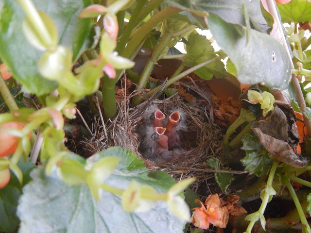 The last time I showed you pictures of the nests in our hanging flower baskets, the baby birds were either just hatching and not very baby bird-looking or they were still in their eggs. They’re a little more bird-like now!