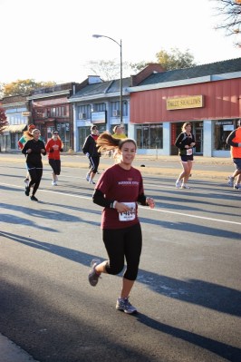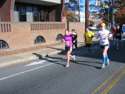 The weather was 35 degrees at the start, which I thought was perfect. I wore running capris and my favorite VT t-shirt (I hadn’t crossed over to technical gear yet and still wore cotton shirts for every run). I also purchased arm sleeves at the race expo to wear. I know- nothing new on race day, but these worked out! During the first few miles we made our way through the city towards Joseph Bryan Park. We ran through city streets and a beautiful neighborhood on our way.