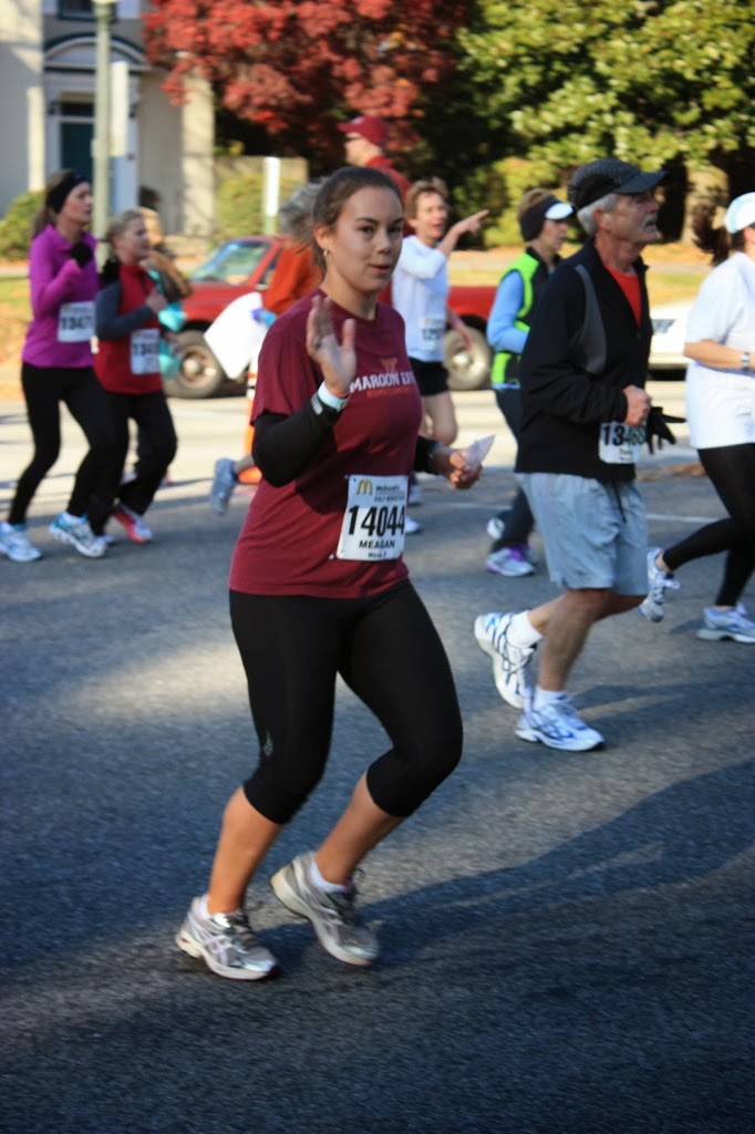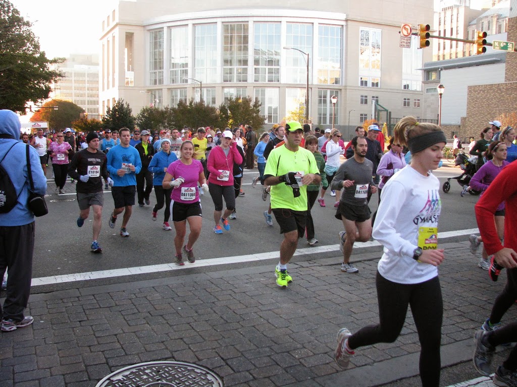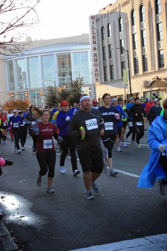 My first time running in Richmond was my official return from my running hiatus. Long story short, I took nearly a year off after going through some major life changes: graduating college, starting my first full-time job, getting a puppy, and getting married all in the span of a month. It took me nearly a year to adjust to all this and realize that a major component was missing in my life: running. So, I signed up for the McDonald’s Half Marathon on November 12, 2011. Training went smoothly and I arrived at the start line ready to run my fourth half. My dad, mom, and sister came down for the weekend to watch me run. Barry was running the full and his parents also came to Richmond for the weekend to cheer us on. My dad and sister biked around Richmond and I got to see them several times, including right at the start.