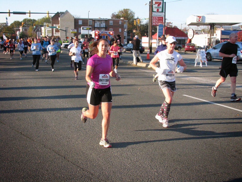 The weather was 35 degrees at the start, which I thought was perfect. I wore running capris and my favorite VT t-shirt (I hadn’t crossed over to technical gear yet and still wore cotton shirts for every run). I also purchased arm sleeves at the race expo to wear. I know- nothing new on race day, but these worked out! During the first few miles we made our way through the city towards Joseph Bryan Park. We ran through city streets and a beautiful neighborhood on our way.