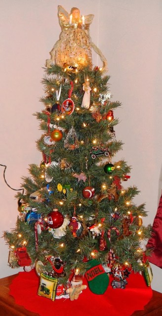 Finally it was time for the coup de gras of decorating: the Christmas tree. Barry and I have a small, artificial tree that I decorate each year. Both of our parents bestowed upon us our childhood ornaments and we have received many others as gifts, so our poor little tree is very full. I love taking each ornament out and thinking of the memory that goes with it as I decorate the tree.