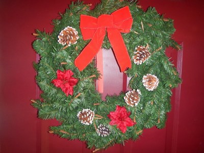 I also hung our wreath on the front door. A few years ago I decided we needed a wreath and I couldn’t ever find a pre-decorated one I liked. So instead I got a bit crafty and bought a plain wreath. I decorated it with a red bow, a few sparkly pine cones, and some clip-on poinsettias and made one that fit my taste.