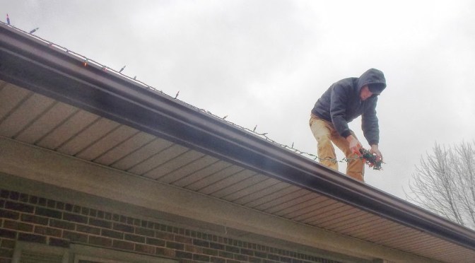 Since his birthday was on Friday it meant Saturday and Sunday were for putting up Christmas decorations. The first thing I had to do on Friday evening and Saturday morning was clean the house. That was another rule growing up that I continue to uphold- you have to have the house clean before you can decorate. Once that was done, Barry and I took advantage of the good weather on Saturday afternoon (they were forecasting freezing rain for Sunday, and they were right!) and got our exterior lights up. Barry does the roof lights and I’m in charge of the bushes.