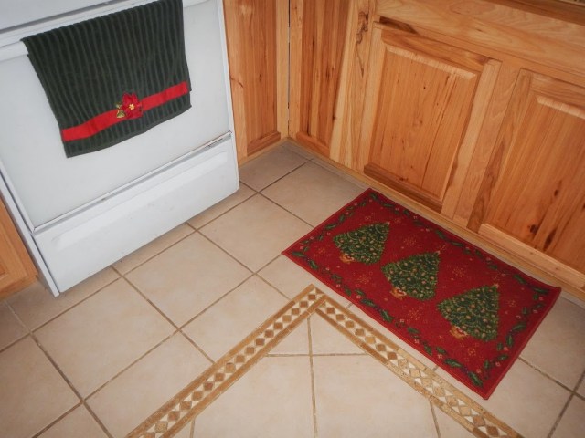 The kitchen was very simple to decorate. Swap out the floor mat at the sink and hang a holiday dish towel on the stove and you’re good to go.