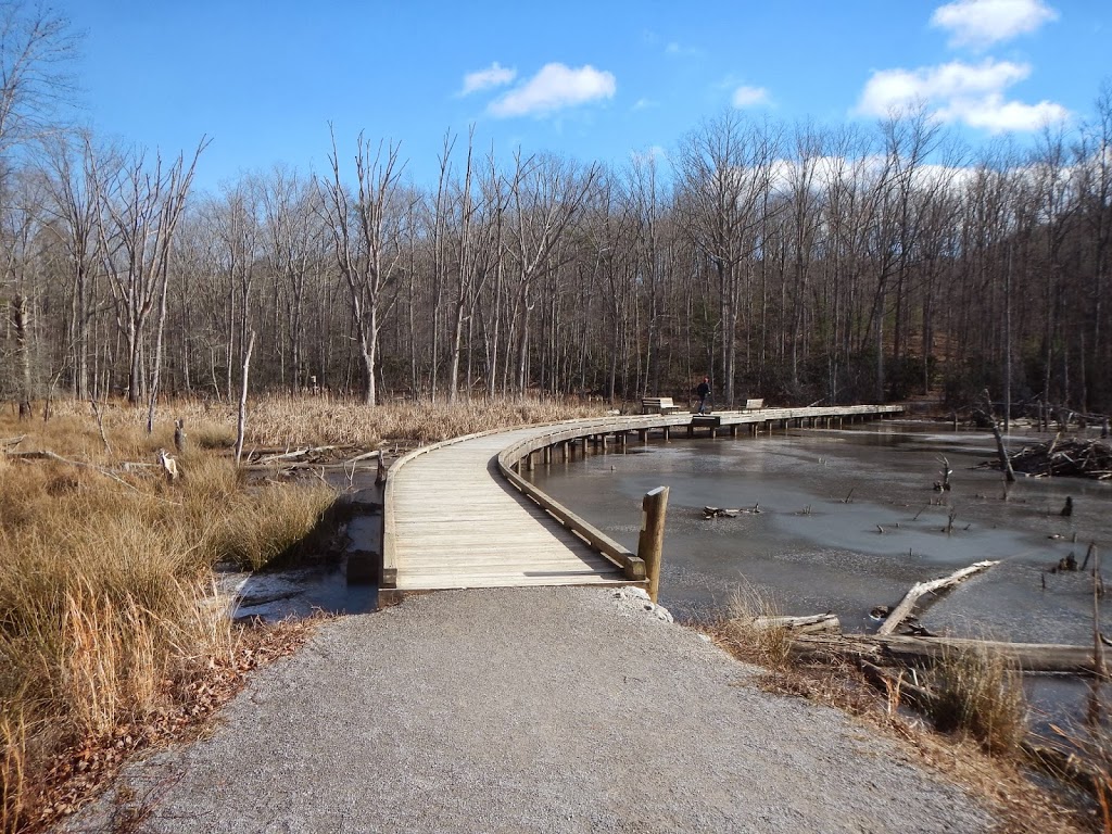With my heart pounding like I had just run up a mountain, thanks to watching that dog cross on the ice, we started to make our way around the pond. I wanted to check out the wetland area. There was a neat bridge that goes over the water there.
