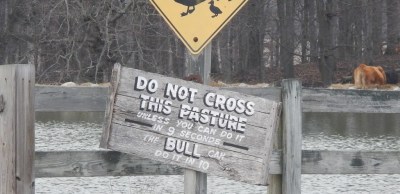 “Do not cross this pasture unless you can do it in 9 seconds. The bull can do it in 10”