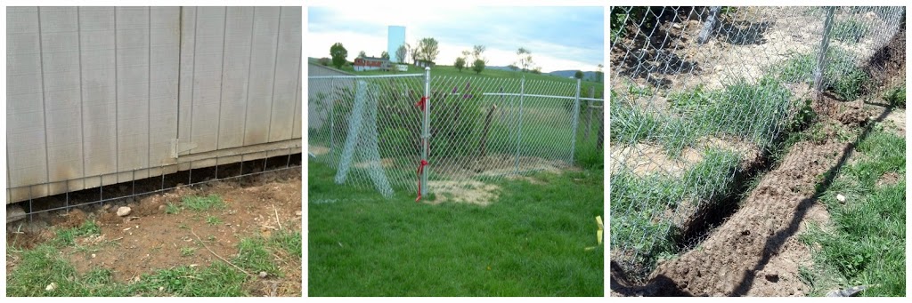 Hog wire along the chicken coop, 5 foot chicken run fence, and chicken wire buried below fence to keep dogs from digging under.