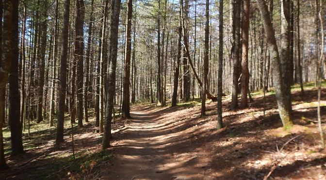 I headed up to the Blacksburg area for a long trail run at Pandapas Pond on the Poverty Creek Trail System late Sunday morning. It had been awhile (since January, I think) since I ran here and I missed it. It’s definitely my favorite trail system. We had some great spring weather on Sunday, and it was breezy and in the mid-50’s. Pretty decent weather for running around in the woods! I got started on a trail with some gentle rolling hills, with plans to make an ascent up Brush Mountain along the way.