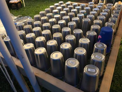 Because this race was on a short loop, we would run through the aid station every 1.2 miles. In an effort to reduce waste, the RD came up with this awesome idea. Our metal finisher cups served as our aid station cup during the race. They had all of the cups marked with our race number on the bottom and they were all stored upside down on a large commercial dishwashing-type crate.