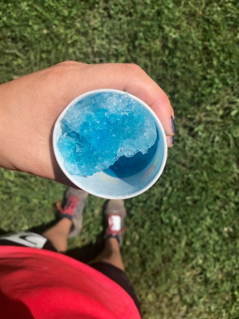 Somewhere in the midst of hour 4, I started to feel really bad. I got nauseous, had some waves of dizziness, and just felt sick. The heat was definitely getting to me. The aid station was so well-stocked, with ice, cold water, soda (Coke, Mountain Dew, Ginger Ale, etc.), and all types of foods. They had sweet foods, salty foods, pickles, etc. They also had actual meal-type foods throughout the weekend for runners (breakfast burritos, eggs and bacon, burgers, hot dogs). And here’s one of the extra special things they had: Sno Cones! I was thrilled to see they had fired up the Sno Cone machine when I rolled into the aid station somewhere between hour 4 and 5. It was the best thing ever.