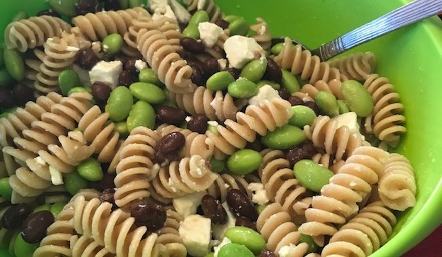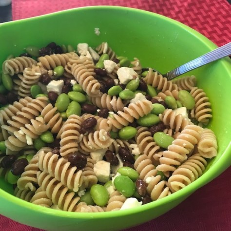 This one is whole wheat pasta, edamame, black beans, olive oil, garlic powder, feta cheese, and a little lemon juice. Again, delicious and filling. I usually have this along with a Greek yogurt, some fruit, and sometimes a turkey sandwich, tuna sandwich, or hard boiled egg.