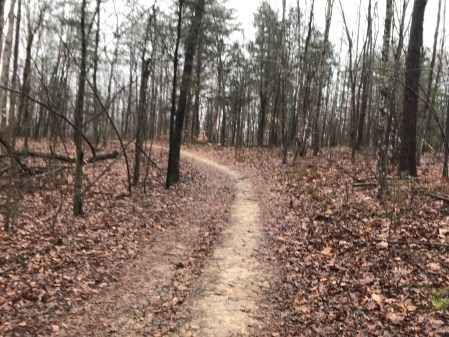 The group was a mix of runners and walkers, and we spread out along the trail over the first mile. We each had been provided with a state park map with the route marked on it. Donna had also been out marking the turns at trail intersections by making arrows on the ground with sticks and marking a few with flour.