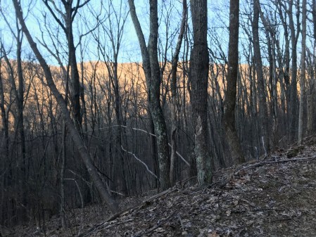 I felt a lot better with the dry layers on, but was immediately freezing again when we got out of the car. I quickly shoved my t-shirt in my pack and got ready to leave the aid station. Some of P’s group was hanging back to wait for more of their runners, but she said she was going to stay with me. We were headed into the final 0.5 – 1 mile climb to the summit of Terrapin Mountain. It had the steepest sections of trail we would see all day, and had the highest wind.