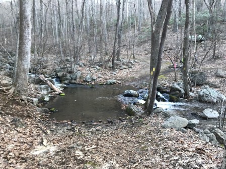 We went through one small stream crossing, and then arrived at a bigger creek crossing just before mile 2.5. I had walked through the first one, as I do most water crossings, not minding getting my feet wet. But at the bigger one, I hesitated for some reason. I saw footsteps off to the left at an upper part of the creek and decided to try and cross there. It was a poor choice. I slipped partway across and fell into the deep water – completely submerging my body and head.