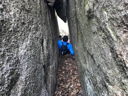 As I headed out on my own, my focus was on getting out of the wind. The trail was rocky, as it roller coastered along the ridgeline. Soon, I arrived at the second ‘highlight’ of the course – a section referred to as “Fat Man’s Misery.” It’s a crevice between two rocks that you have to lower yourself into and shimmy through. It was kind of cool, but honestly not my favorite.