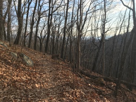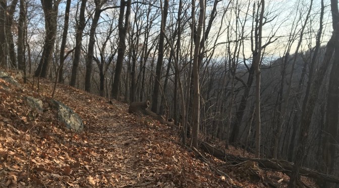 At 9 AM we were off and running. We did a short section on the road before heading onto the singletrack trails of the Chestnut Ridge Loop. Things spread out a bit, but Kim and I still encountered a bit of a bottleneck when we got onto the trails. Neither of us minded, though. We were out there to have fun and kick off the new year.