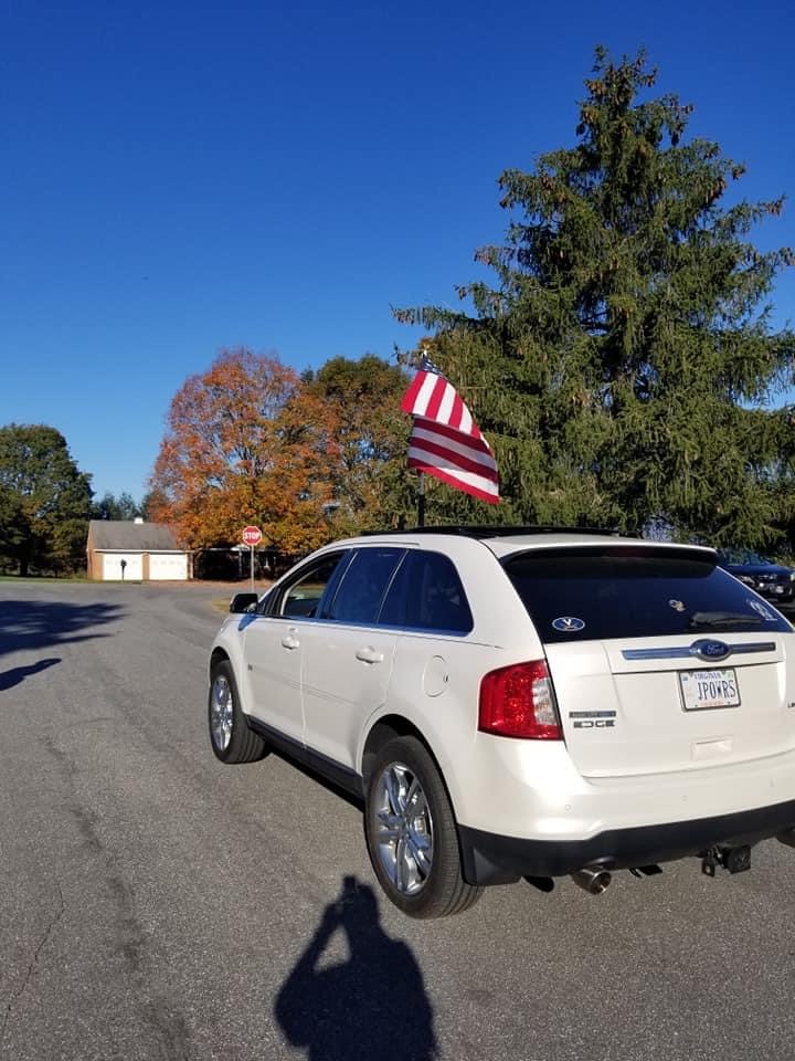Just before mile 25, Felix and I ran up a huge hill to the Welcome Center. I had to pee (again), so I ran past our turn and to the Welcome Center. Our crew was there in the parking lot and someone laughed at me for needing another restroom break. Felix waited for me on the corner and Brandy, Char, and Char’s dad passed by while I was inside. I linked back up with Felix and we had fun hammering to catch up with them on an out and back to the elementary school. On the way back, we met up with our crew and Janet passed out flags to each of us for our finish up a very big hill to the D-Day Memorial. This was it. Homestretch.