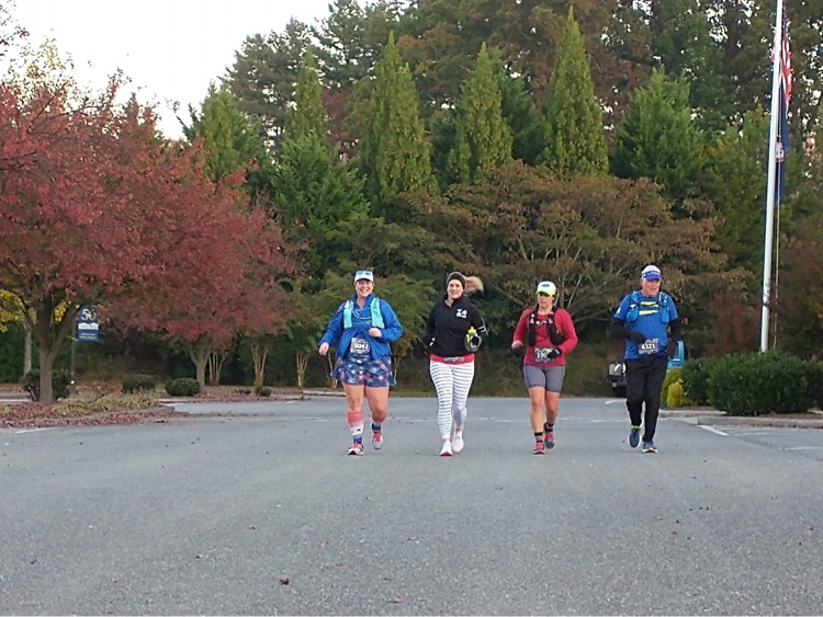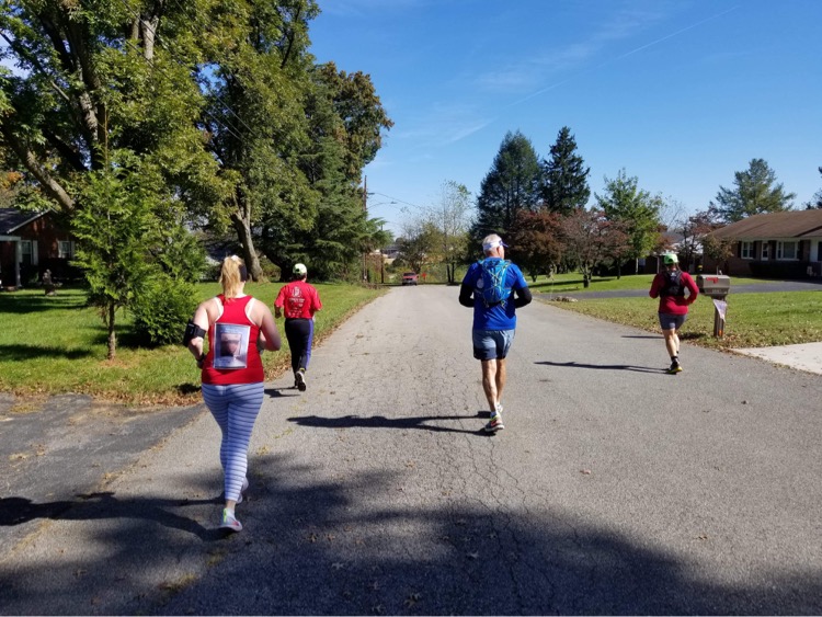 All of our crew joined in with us for our next mile. Char and her dad recreated the Marine Corps Marathon blue mile by incorporating walking by the Bedford Boys memorial flags that line Main Street in Bedford. We also passed by Green’s Drug Store. It was special to share this together as a group, runners and crew.