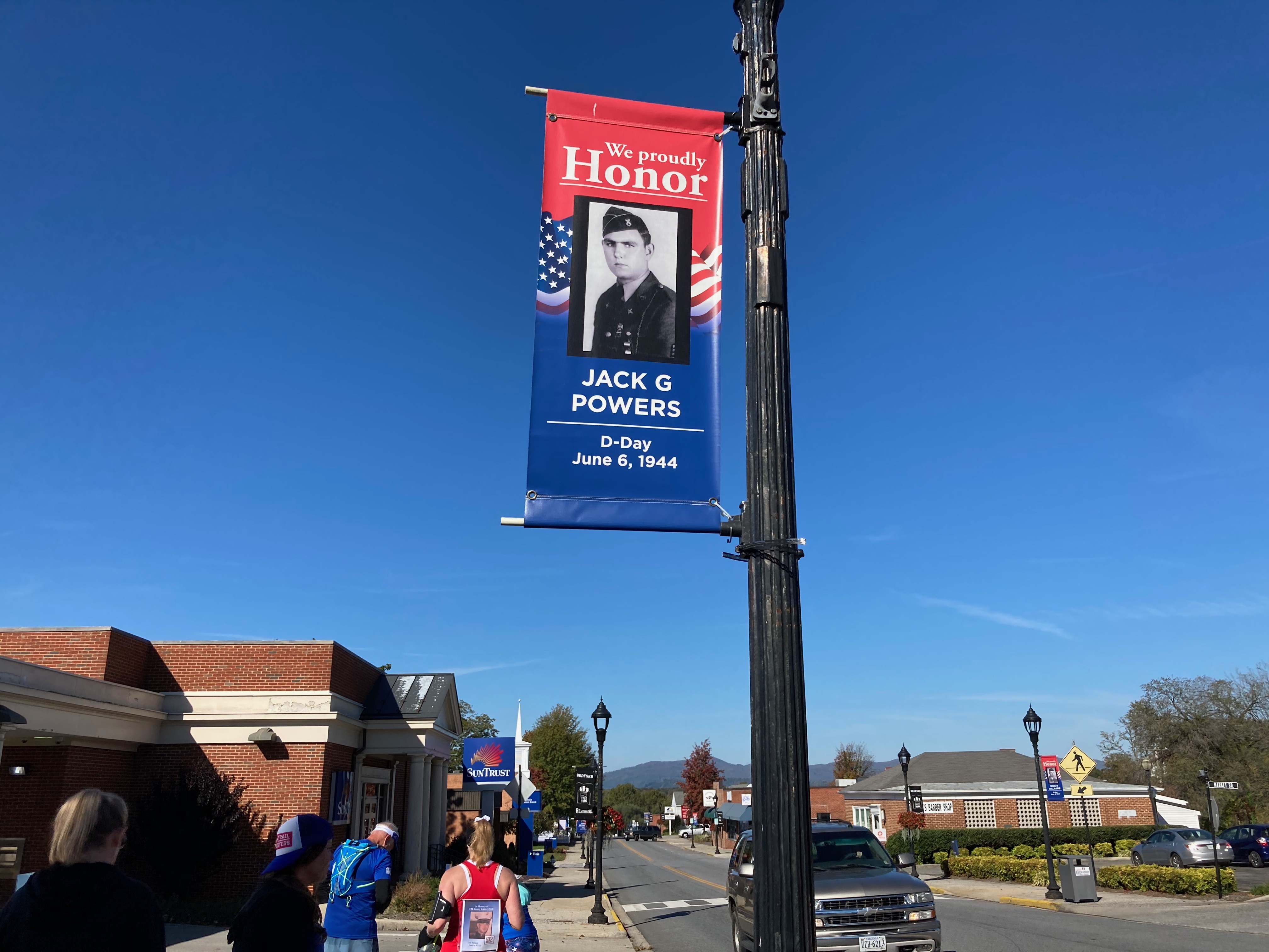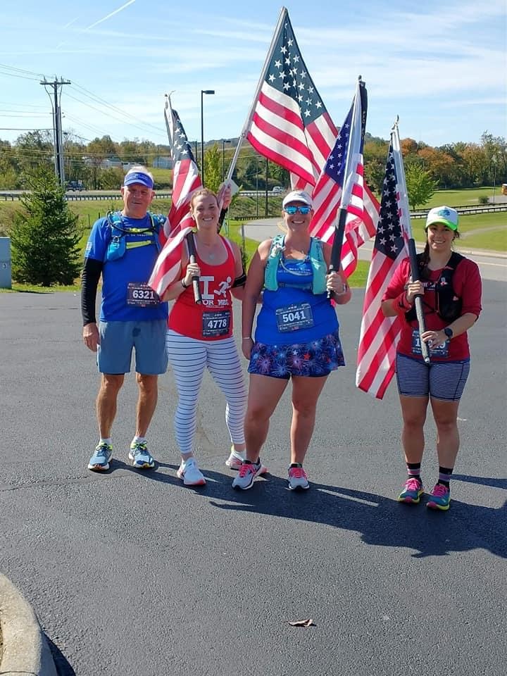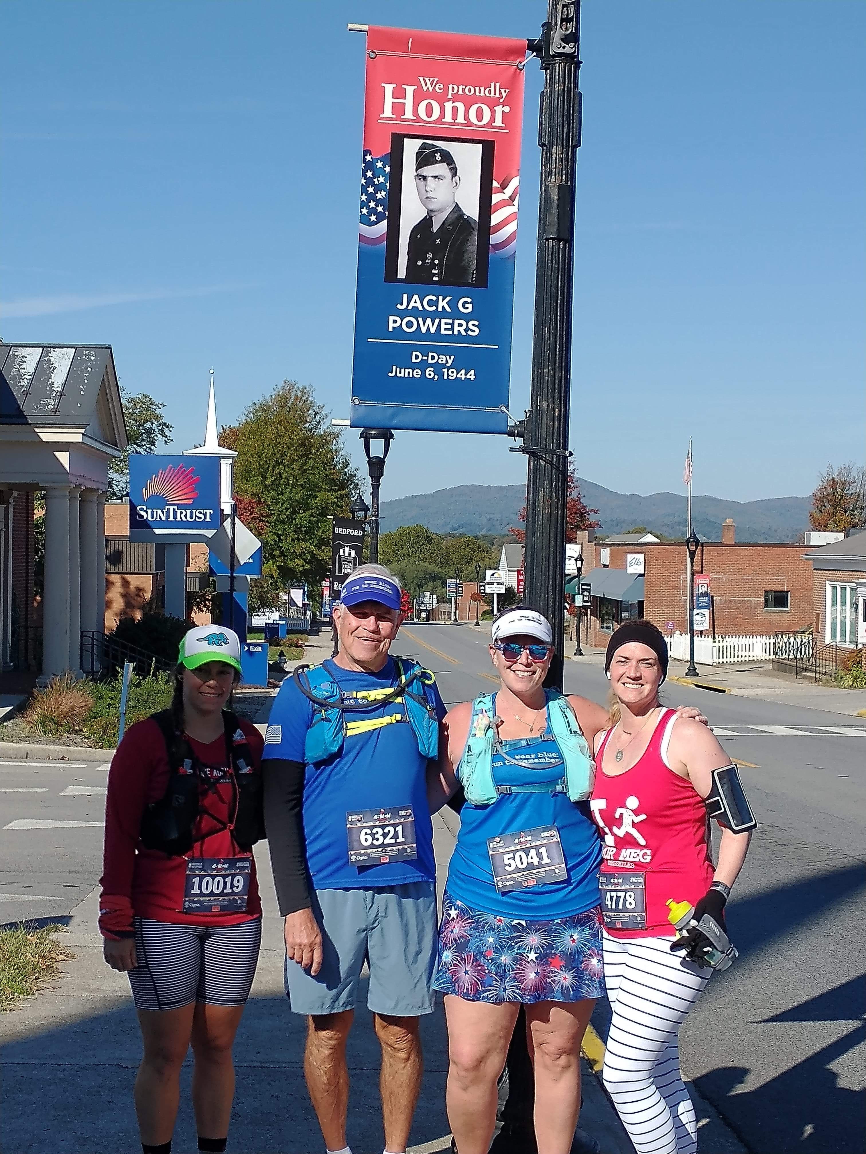 All of our crew joined in with us for our next mile. Char and her dad recreated the Marine Corps Marathon blue mile by incorporating walking by the Bedford Boys memorial flags that line Main Street in Bedford. We also passed by Green’s Drug Store. It was special to share this together as a group, runners and crew.