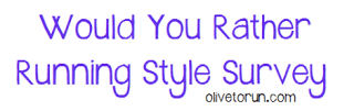 We are headed home from vacation today. It’s always a sad day, but it also feels good to get home. Today is a rest day, so instead enjoy another Would You Rather Running Style Survey from Cori over at Olive to Run. If you missed it, HERE is her post. This was number 4 in her survey series. I also completed survey #3. Without further ado, here is survey #4!