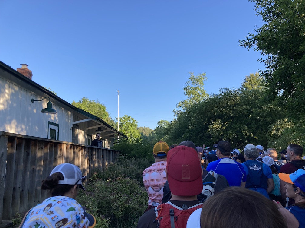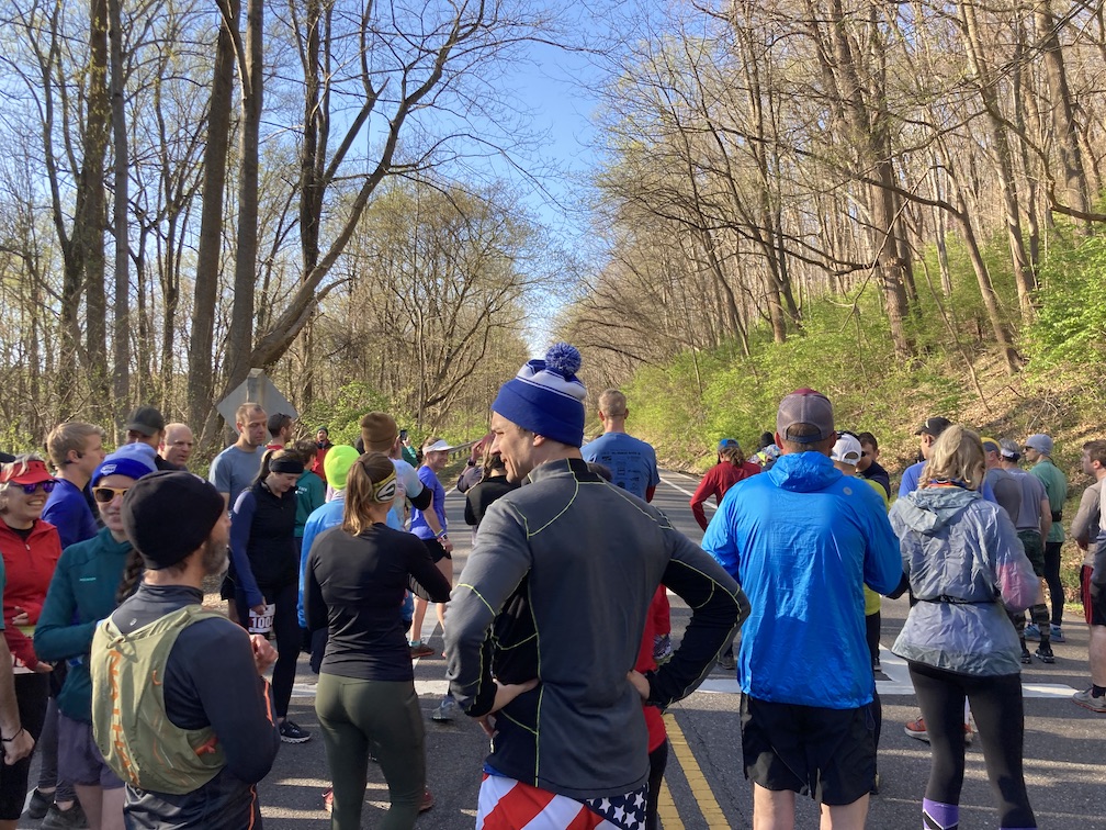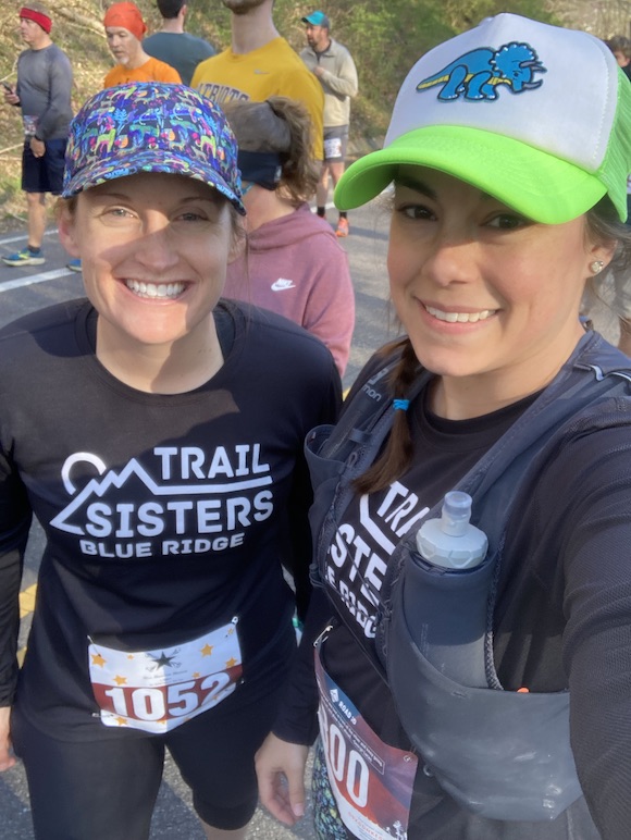 I was up at 3:45 AM on Saturday morning and had my usual oatmeal and coffee. We left Damascus at 5 AM to catch the race shuttle in Abingdon. I was worried about getting carsick on the 50ish minute drive up to Whitetop, since the roads are really curvy. Fortunately, my Dramamine did its job and I also ended up with a front passenger seat in the shuttle. My shuttle arrived in Whitetop around 6:45 AM and I took a quick bathroom break in the woods before heading to the start. It was in the low 50’s and I was freezing, but that was perfect for race day. I met up with Charlotte and Christine, who were on a different shuttle up to Whitetop, and we exchanged hugs and some final words of encouragement. I was feeling SO nervous. This was it.