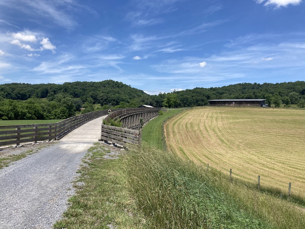 Shortly thereafter, I ran across another really cool bridge on the trail. It was so hot through here, but there was a bit of a breeze which helped. The suffering was in full effect. The muscles in the fronts of both of my shins were threatening to cramp, and my left hamstring felt like it was locking up or about to cramp during every run interval. But I thought “Oh, hell no. I am 3 miles from my goal and I did not come this close to blow up now.” I chugged a bunch of my Liquid IV and hoped the salt would fend off the cramps. I also shortened my stride during my run segments, which seemed to help my hamstring some. But I was not willing to back off on my effort. I was so close to my goal. I was starting to realize that not only could I get under 6:30 for 50K, I would likely get under 6:20 if I kept it up!