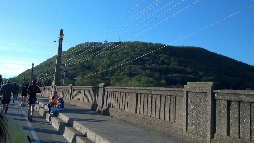 Kim and I ran together for most of the first mile before parting ways. The race starts in downtown Roanoke and crosses a larger bridge on Walnut Avenue. As you cross the bridge you get a nice view of the Roanoke Star and Mill Mountain, which you will soon be ascending. You can see the star on the right at the top of the mountain in the below picture.
