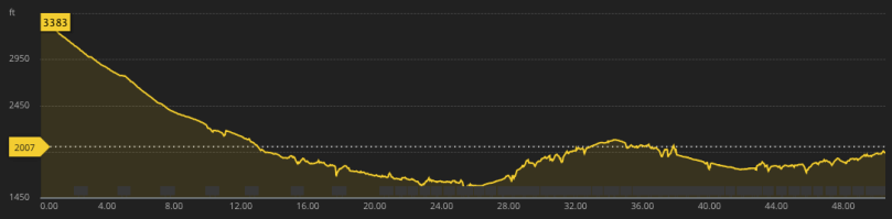 Screen Shot 2019-06-04 at 5.35.40 PM June 4, 2019 1086 × 267 Screen Shot 2019-06-04 at 5.35.40 PM Elevation profile for the entire race. Big downhill from miles 0-18, and a gradual uphill from 18-34ish.